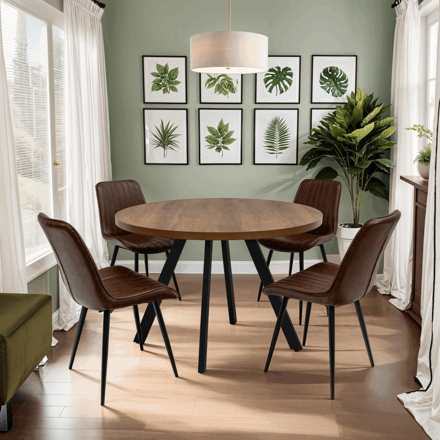 The Panama Dark Oak Extending Dining Table showcases modern character with its striking dark oak melamine top and industrial-style x-shaped black powder-coated legs. This table not only serves as a visual masterpiece but also features a convenient one-hand extension mechanism for effortless use, making it perfect for both everyday dining and special occasions. Available in other sizes also.