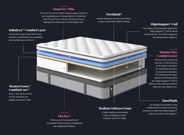 The AlignSupport® Coil, patented by Sealy, is twice tempered for exceptional strength and durability, offering deep-down support and long-lasting performance for years to come. The UniCased® XT system reinforces the entire mattress edge, extending the sleep surface and preventing any roll-off sensation. Additionally, innovative air channels enhance the mattress’s edge, making it more durable and responsive to prevent any dipping when sitting on it.